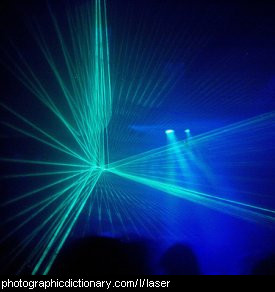 Lasers have many, many uses in science and medicine. Less powerful lasers are also commonly used in laser pointers for pointing out words on a screen or whiteboard, and used to make light shows in nightclubs, as seen in the picture.