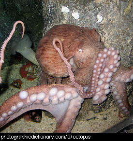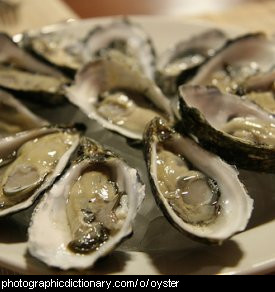 Oysters are a kind of mollusc that lives in the sea or salty water. Their shell is in two halves like a clam shell, and the oyster can pull it closed. Oysters eat by filtering food from the water that flows over its shell. They live their adult lives stuck to rocks - a young oyster that has just stuck to a rock is called a spat.
