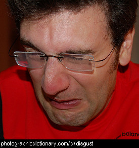 You feel disgust when you have a sudden, very strong dislike of something. Some smells, like rotten food, are disgusting. The person in the picture is disgusted.