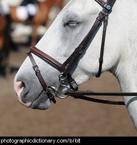 A bridle is a piece of equipment that a horse wears on its face. A bridle is usually made from leather, and is held on by buckles. The metal part of the bridle that goes in the horses's mouth is called the bit, and the long straps connected to the bit are called reins.